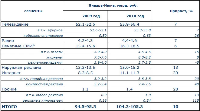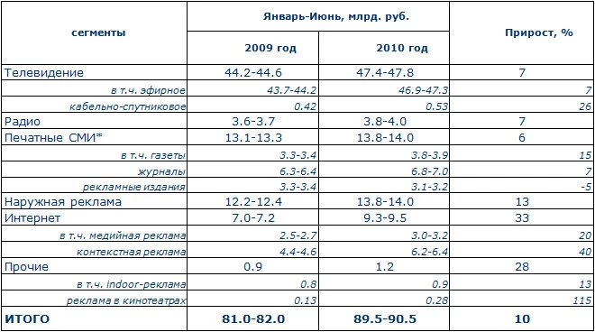 Суммарный объем рекламы (ATL + BTL) в средствах ее распространения составил, по данным АКАР, 105 млрд руб. (с НДС), что на 10% больше, чем за аналогичный период предыдущего года. Во втором квартале текущего года российский рынок рекламы вырос почти на 15% по сравнению со вторым кварталом 2009 г.