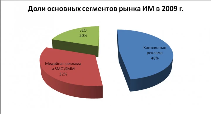По мнению большинства аналитиков, без учета сегмента поисковой оптимизации и раскрутки сайтов (SEO) объем рынка интернет-маркетинга в России по итогам 2009 года составил около 19—20 млрд рублей, с учетом SEO – около 25 млрд руб. Доли основных сегментов рынка интернет-маркетинга в 2009 гг. (по данным АКАР и Newmann Bauer) распределились так: контекстная реклама – 11,3 млрд руб. с НДС (48%), медийная реклама и SMOSMM – 7,7 млрд руб. (32%), SEO – 4,7 млрд руб. (20%) - см. диаграмму № 1.