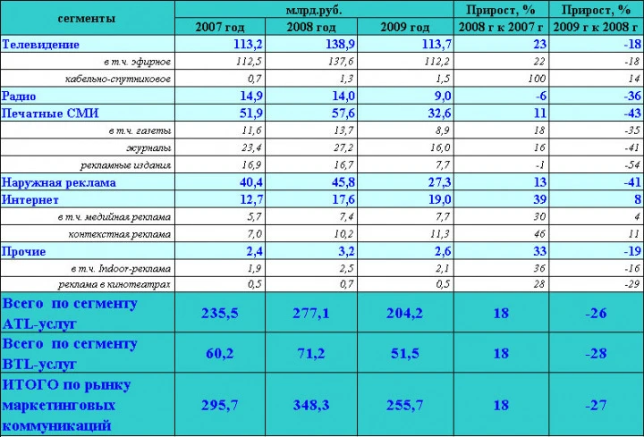 Табл. № 1. Объем медиа рекламного рынка в 2007—2009 гг. — в млрд руб., включая НДС. (по данным АКАР).