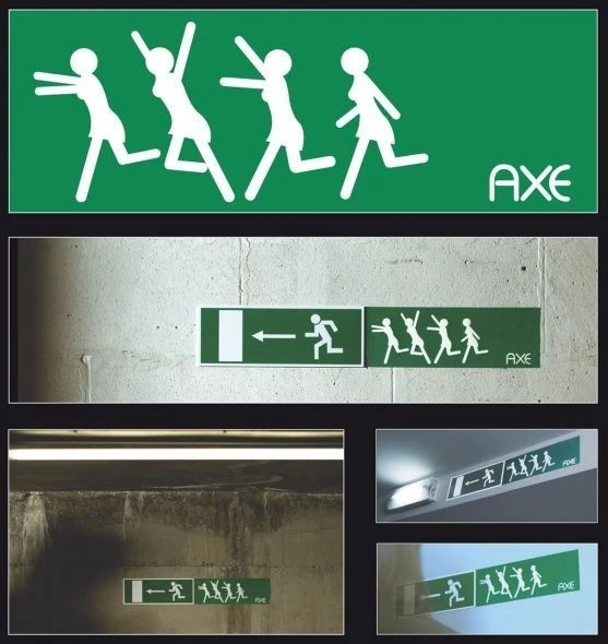 - Компания Axe размещала брендированные креативные вывески с изображением бегущих женщин справа от указателя на выход. Такая забавная комбинация «подсказывала», где можно скрыться от назойливых поклонниц и точно привлекала внимание прохожих, вызывала улыбку и желание поделиться шуткой с друзьями.