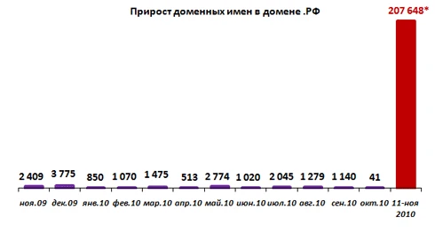 То, о чём так долго говорили — свершилось! В первые 24 часа свободной регистрации в кириллической доменной зоне .рф было зарегистрировано 260 тысяч русскоязычных имён. Всего за сутки открытой регистрации домен .рф вошел в двадцатку крупнейших европейских доменов, а за неделю число имён в кириллической зоне достигло полумиллиона. К концу года, по прогнозам Департамента маркетинга Demis Group, их количество может преодолеть отметку в 1 миллион регистраций. Для сравнения, 500 тысяч доменов в зоне .ru было зарегистрировано лишь спустя 12 лет после ее создания, а за первый год существования Рунета было зарегистрировано всего 86 доменов.