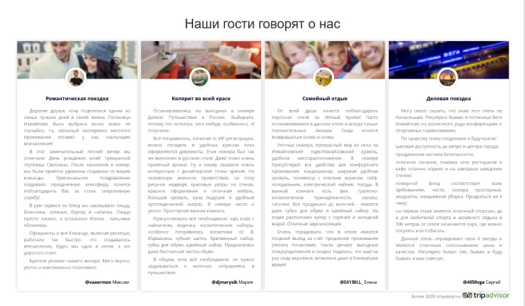 Бронируя гостиницу в чужом городе, каждый хочет быть уверен, что по приезде его действительно будут ждать. Поэтому не должно быть ни малейшего сомнения в надежности отеля. Как этого достичь? Разместите максимум информации: реквизиты, реальные отзывы, возможность пообщаться с администратором. Например, хорошо заходят ссылки на рейтинги в ведущих сервисах бронирования. И конечно, отзывы реальных постояльцев.