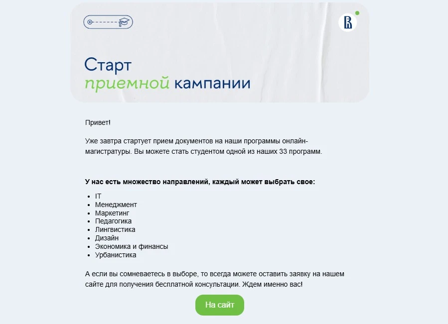 Пользователь получает письмо, сообщение или push-уведомление с персонализированным предложением — рекламой интернет-магазина, услуги или товара. И если оно его заинтересовало, переходит по ссылке и совершает целевое действие: покупку, регистрацию, заявку.