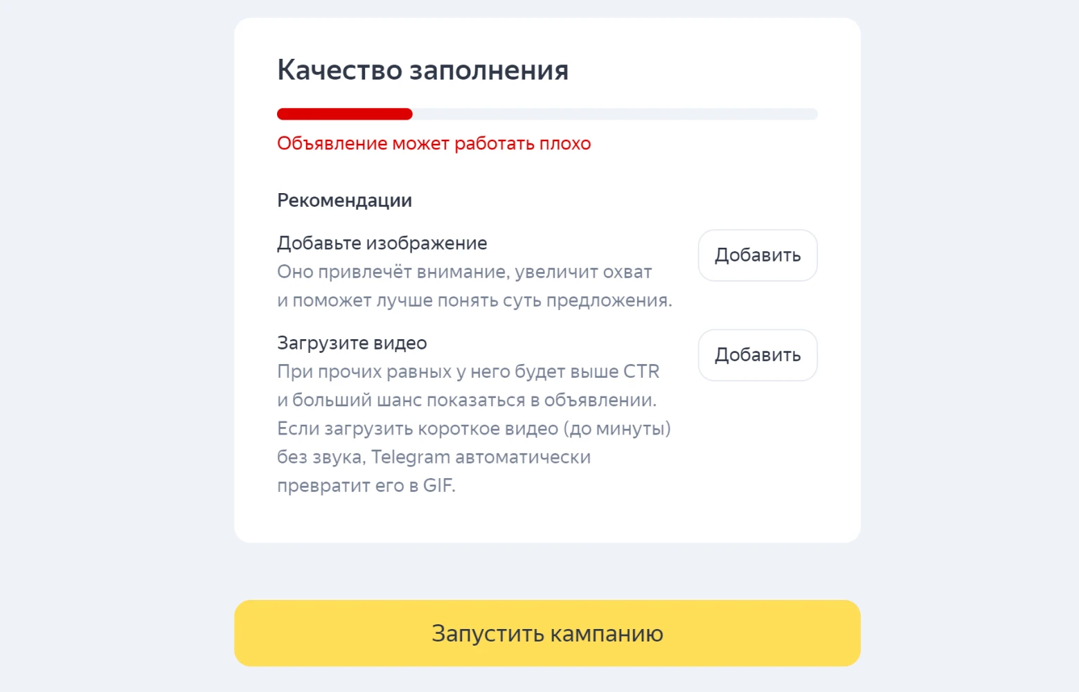Готовое объявление проверяют: ссылка, разметка, заголовок, медиафайл. На этом этапе стоит еще раз изучить рекомендации системы.