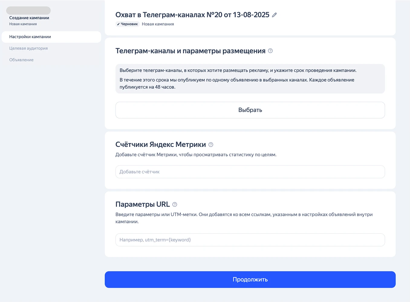 После выбора каналов указывают период показов — от 4 до 15 календарных дней. Далее, как и в кампаниях с оплатой за клики, подключают счетчик Метрики, добавляют UTM-метки, если пользователей уводят на сайт.