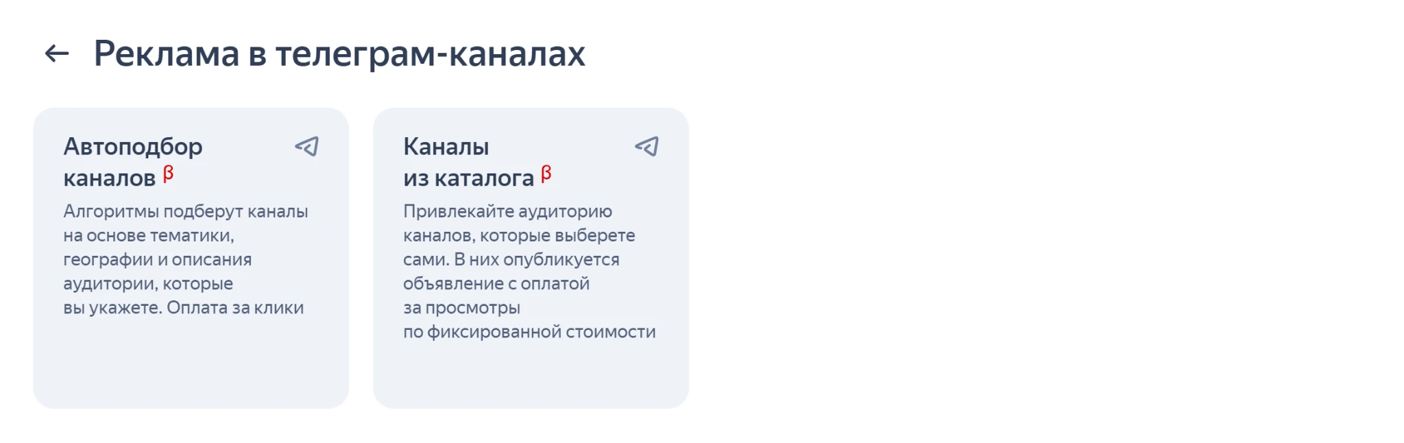 Если цель кампании — увеличить охват целевой аудитории, повысить узнаваемость бренда, выбирают второй вид Яндекс рекламы в Телеграм-каналах — «Каналы из каталога».
