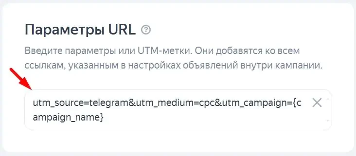 Добавляют UTM-метки в поле «Параметры URL», и система автоматически применяет их ко всем объявлениям.