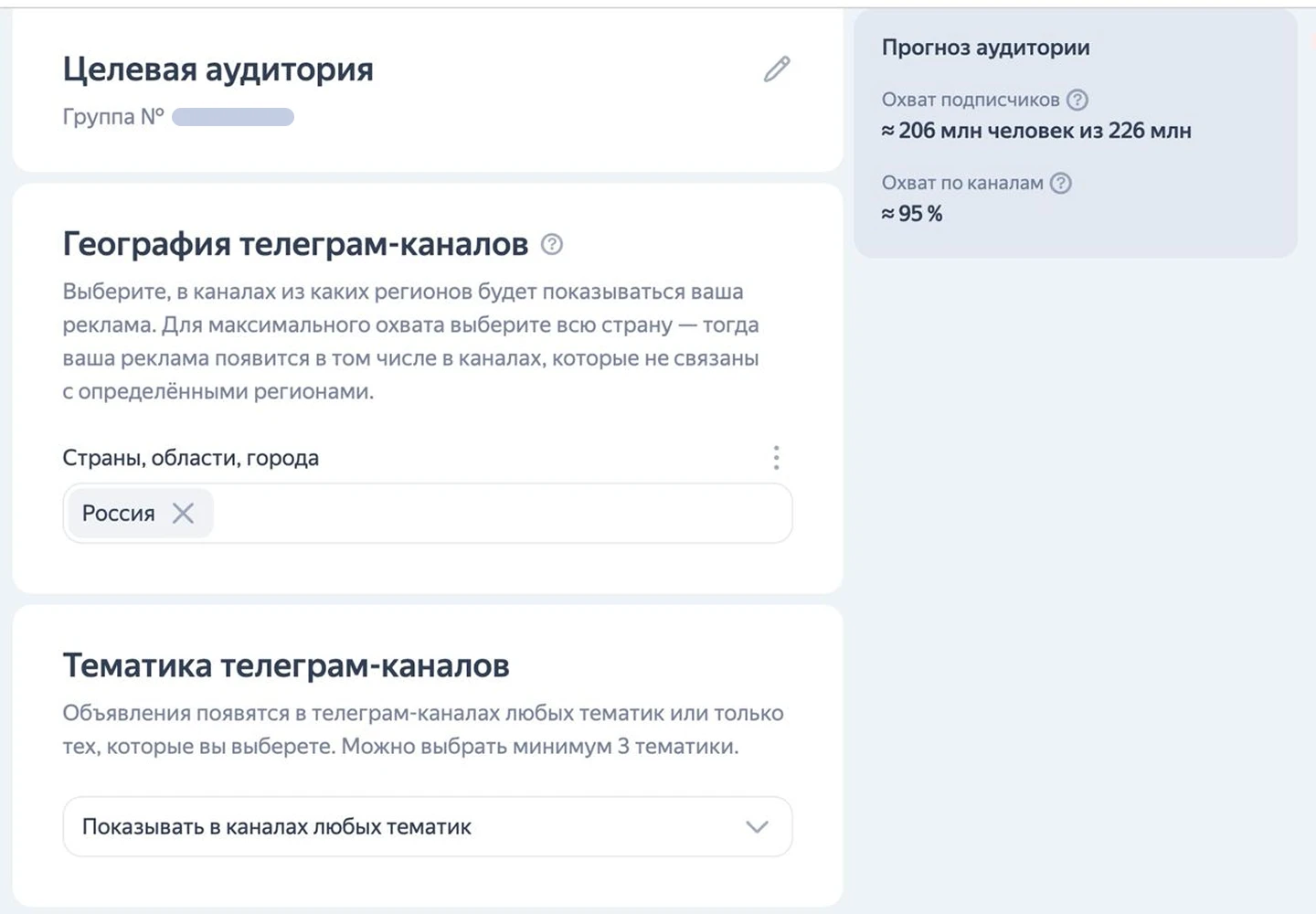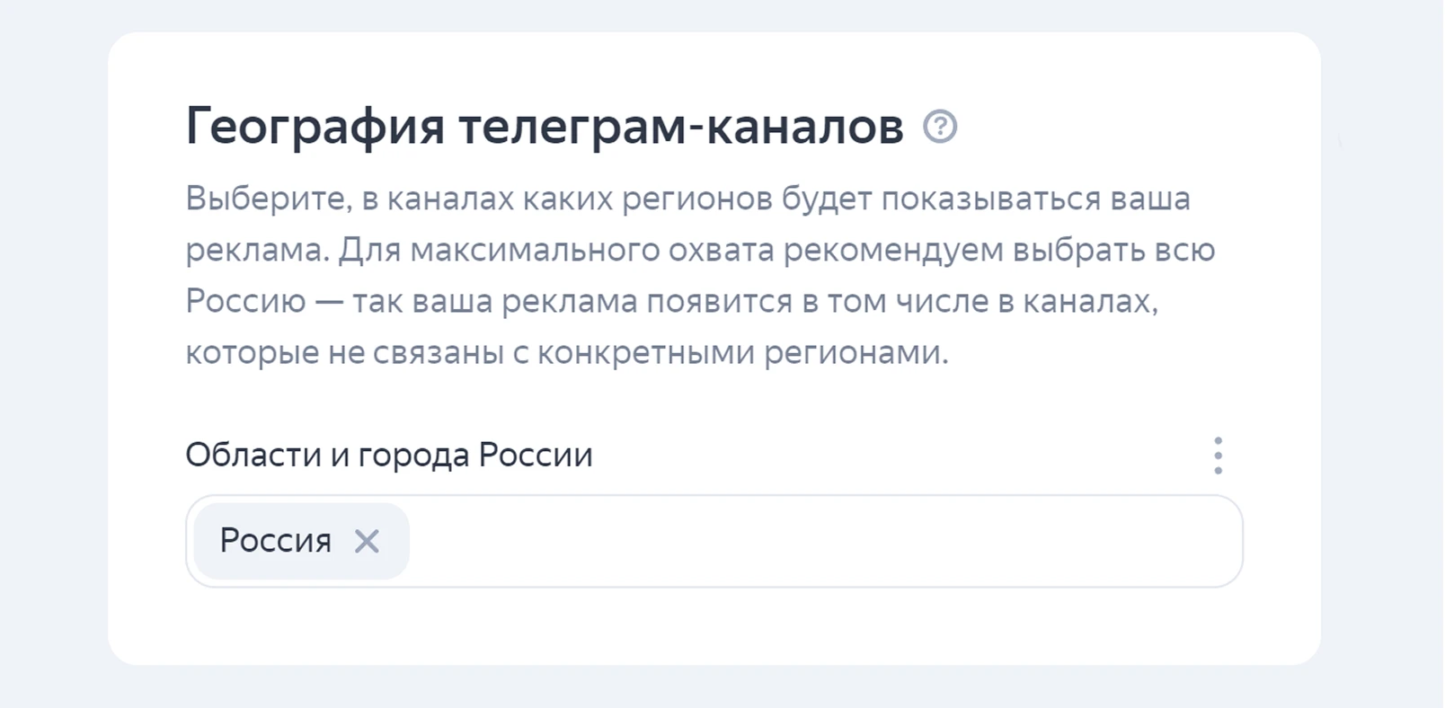 Для максимального охвата можно выбрать всю страну, но если речь идет о продвижении локального бизнеса или канала, строго привязанного к отдельному региону, то географию показов лучше конкретизировать.