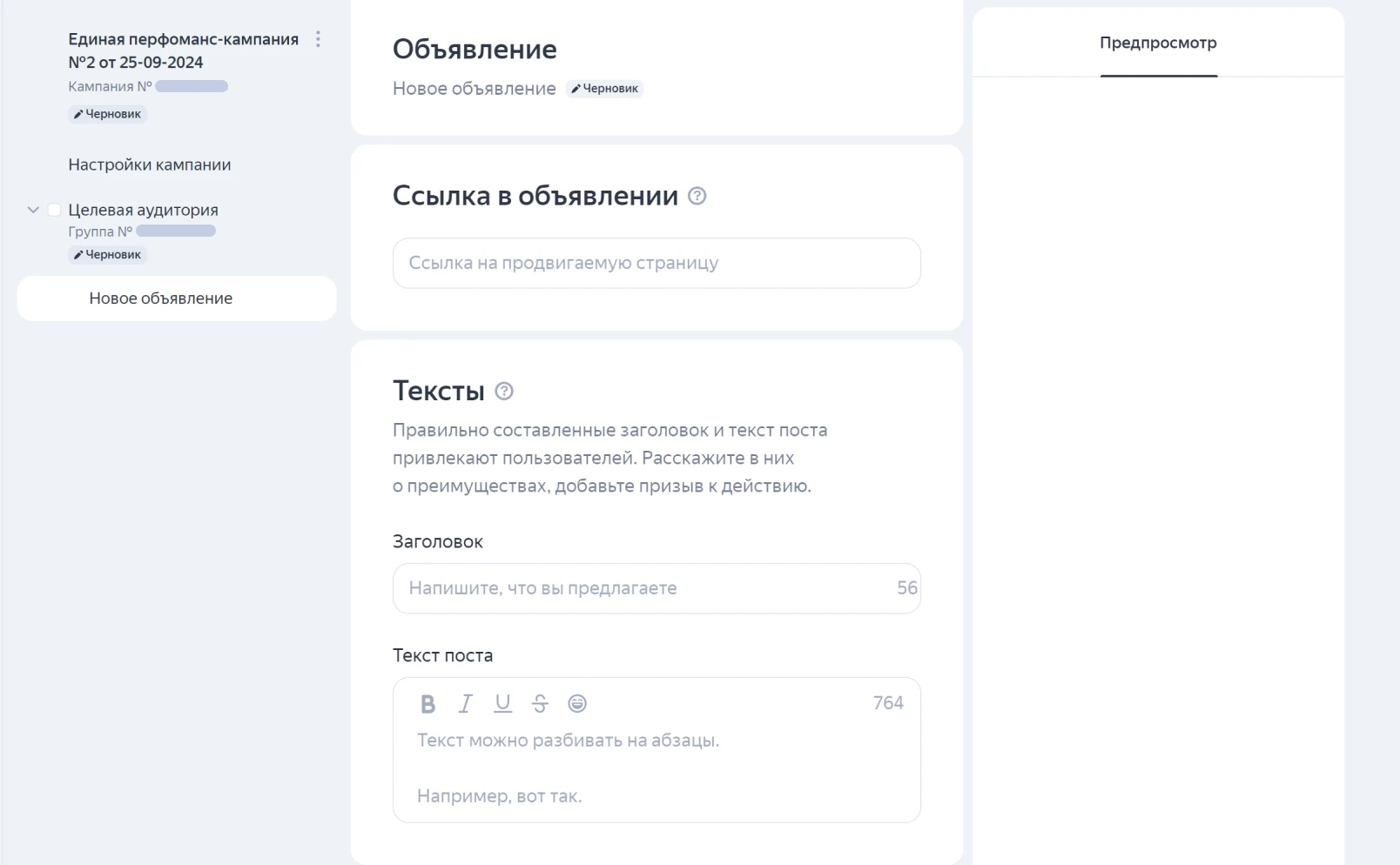 Процесс создания самого объявления ничем не отличается от его настройки для тематических каналов.
