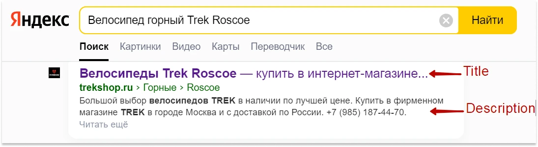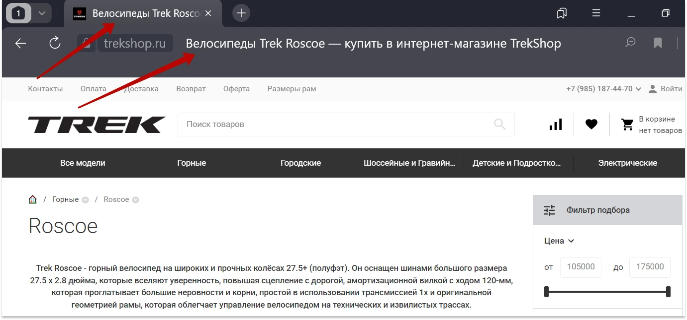 Title. Это заголовок страницы, который будет отображаться у пользователя в строке браузера и в выдаче поиска. Он ограничен 70 символами. Сюда вписываем высокочастотные запросы и уникальные характеристики товара. Например, «Купить горный велосипед Trek Roscoe 27.5” с бесплатной доставкой».