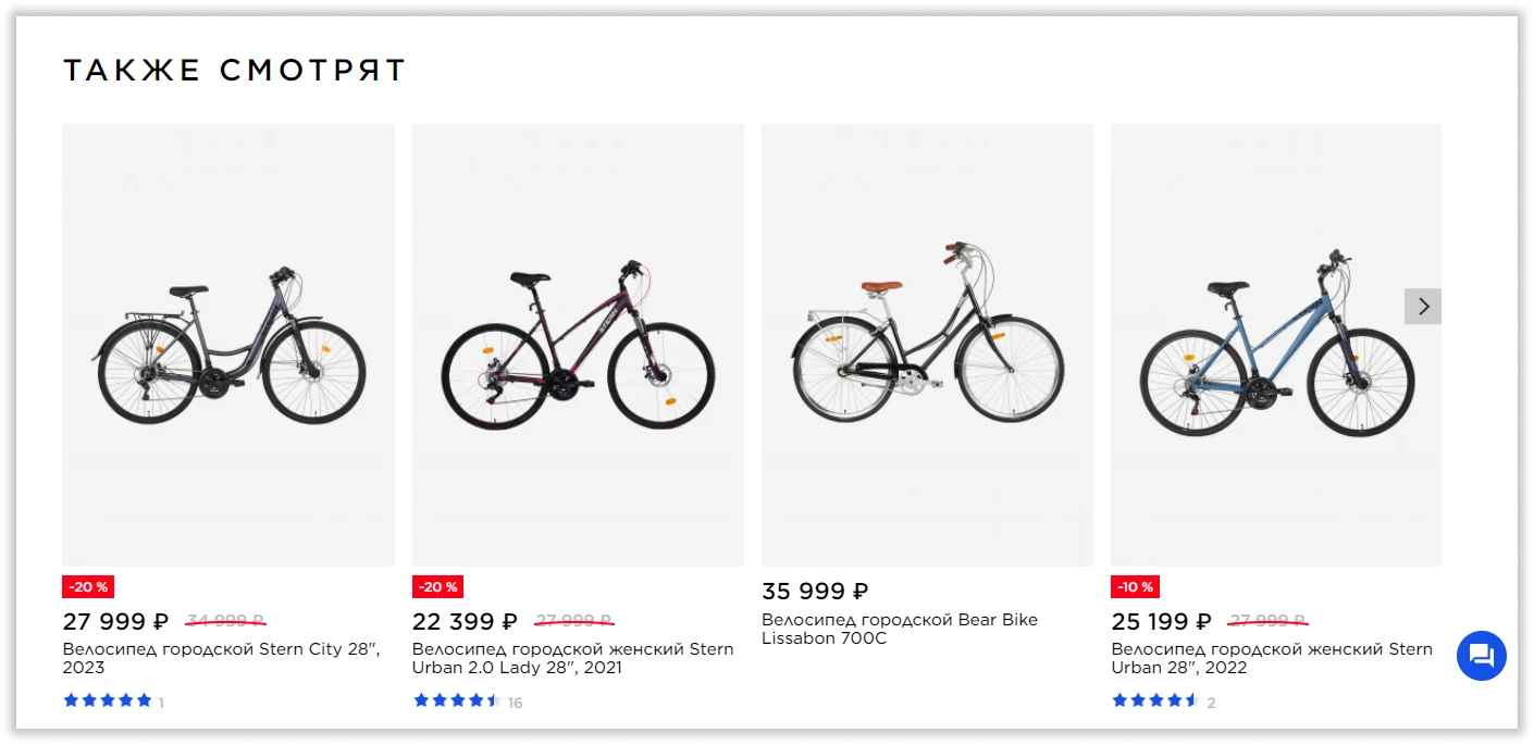 Пользователь может пролистать карточку городского велосипеда, а потом подобрать похожий вариант, но дешевле, или посмотреть женский велосипед для жены или мамы