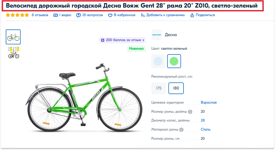 H1. Это заголовок карточки товара. Он должен отличаться от метатега title и состоять максимум из восьми слов. Здесь нет ограничений по символам, но если написать все преимущества сразу, можно запутать пользователя. Сюда вписываем высоко- и среднечастотные запросы, уникальные характеристики. Не нужно добавлять слово «купить», так как это предполагается площадкой и выглядит как перенасыщение карточки ключевыми фразами. Лучше писать так: «Горный велосипед для подростков Trek Roscoe 27.5”».