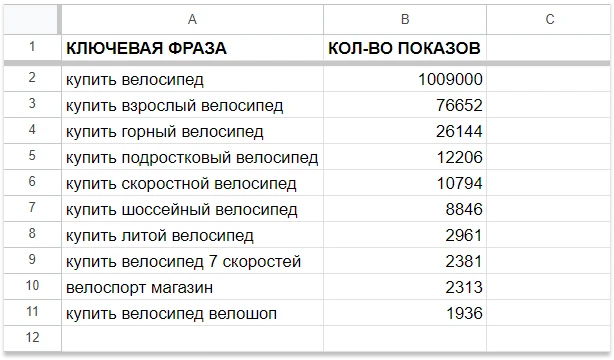 Из всех подходящих товару фраз получится семантическое ядро — это 10–12 запросов с разным количеством показов в месяц. Их нужно вручную перенести в таблицу, которую можно сделать в Excel или Google Sheets.