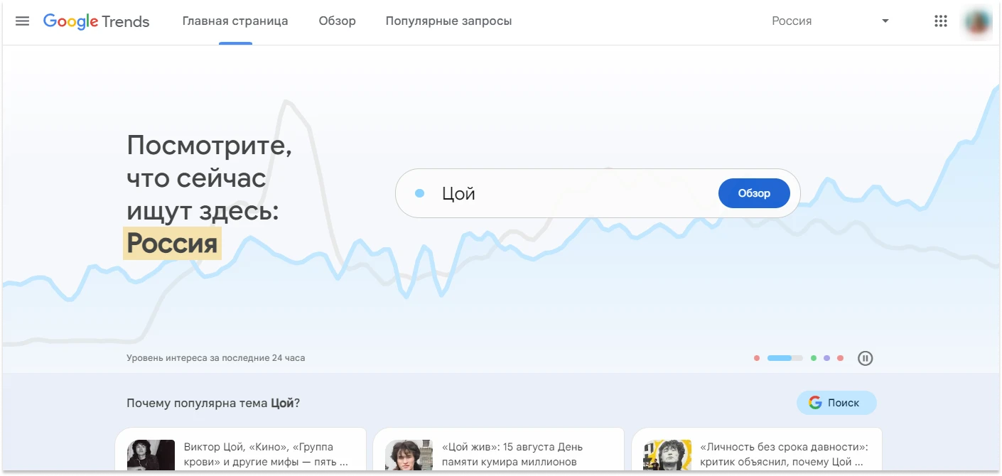 На главной странице Google Trends можно узнать, что интересует пользователей прямо сейчас. Изображение взято с trends.google.com