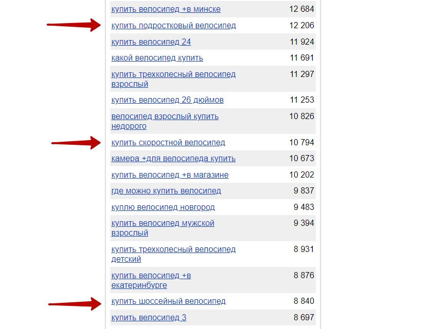При поиске фраз через «Яндекс Вордстат» нужно ориентироваться на количество показов. Так, запросы с подростковым и скоростным велосипедом относятся к высокочастотным, а с шоссейным — к среднечастотным. Низкочастотные будут уже на следующей странице выдачи