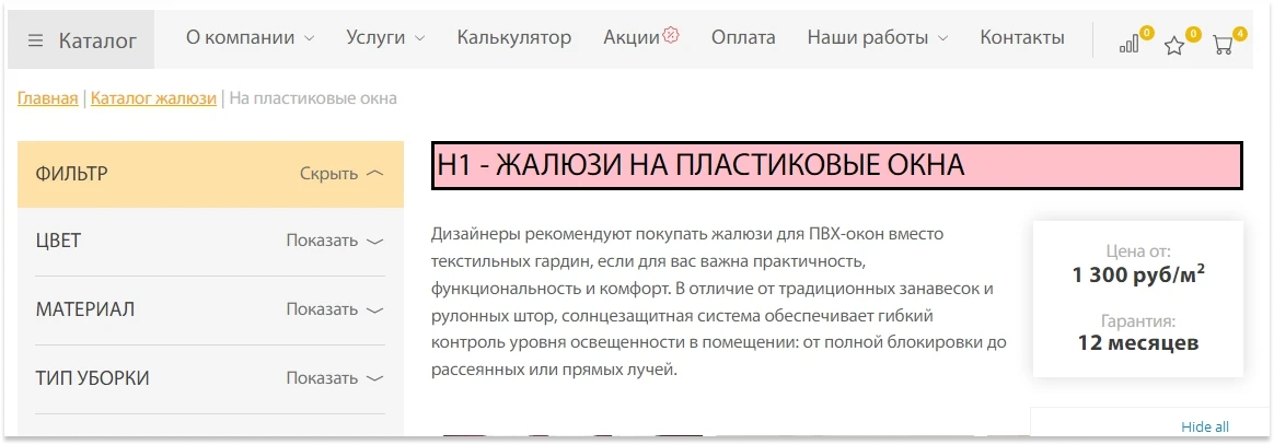 На сайте штор продавец оформил заголовок из четырех слов, уточнил запрос «жалюзи на окна» словом «пластиковые»