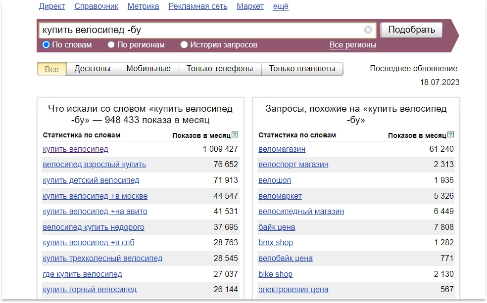 Найти больше фраз помогут похожие запросы из правой колонки «Яндекс Вордстата» — среди них можно сразу выбрать подходящие под товар или почерпнуть идеи для новых: «велоспорт магазин», «велошоп».