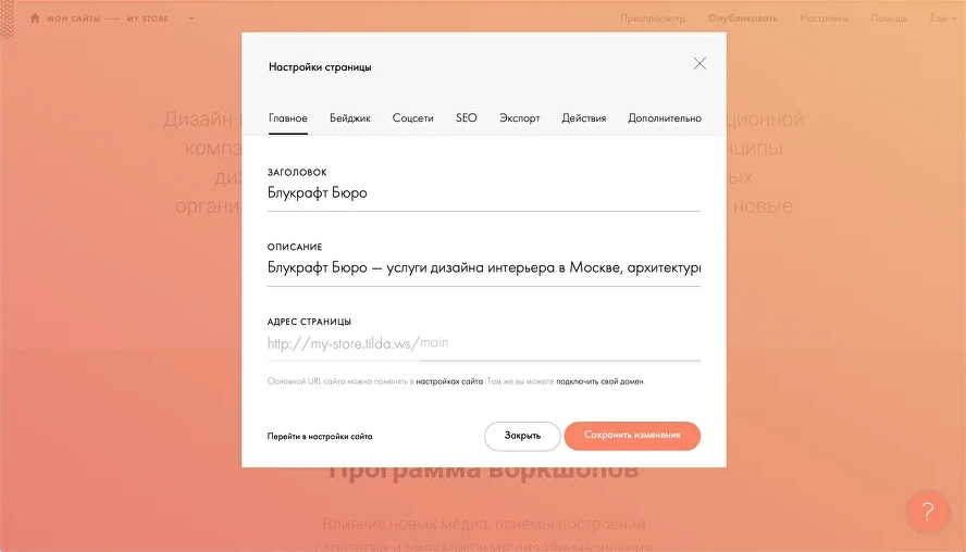 В Tilda во время создания создании страницы вы можете сами вручную указать ее адрес. Используйте ключевые запросы, чтобы помочь поисковикам правильно ранжировать сайт. Настройка ЧПУ — важная часть внутренней оптимизации и один из основных факторов ранжирования.