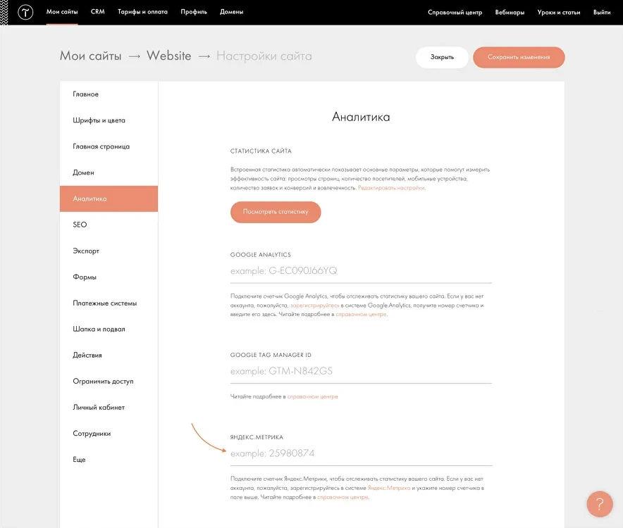 Tilda предлагает удобный механизм вставки кода: достаточно вставить идентификатор счетчика, и система автоматически подключит его ко всем страницам.