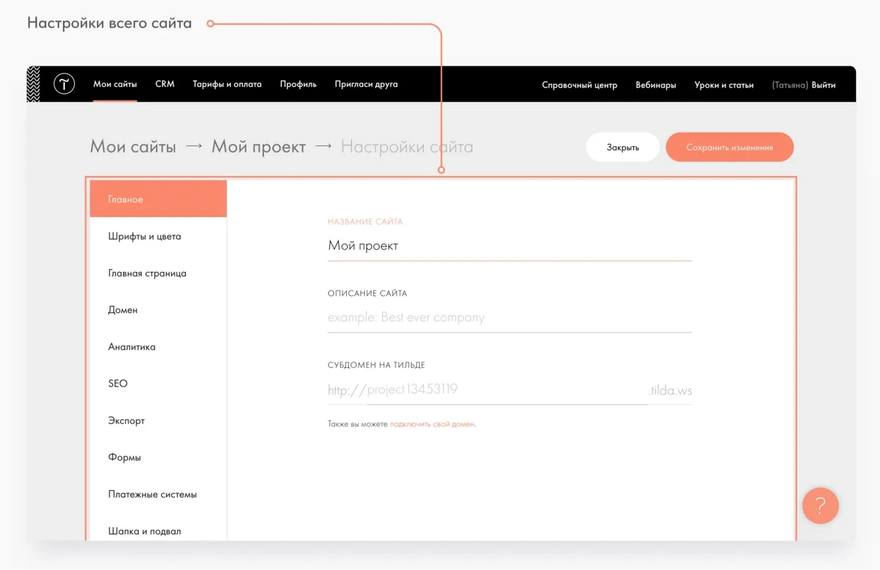 Первый шаг — подключение собственного домена. Использовать стандартный адрес вида project1234.tilda.ws не рекомендуется: поисковики хуже воспринимают такие поддомены, а доверие пользователей к ним ниже. Чтобы укрепить бренд, важно закрепить основной домен за проектом.