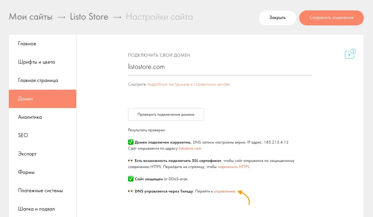 В настройках сайта в панели Tilda есть раздел «Домен». Здесь указывают имя, приобретенное у регистратора, и прописывают DNS-записи. Платформа позволяет вам подключить сервисы Яндекс и Google для проверки корректности привязки. После подтверждения сайт начнет индексироваться по новому адресу.