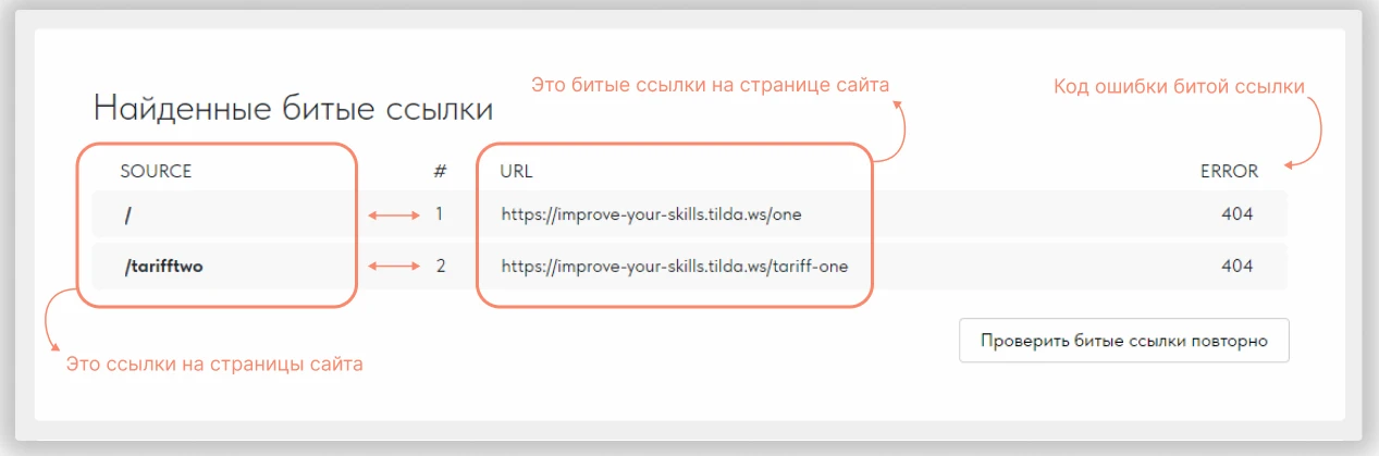 Подобные ссылки мешают индексации и ухудшают видимость в результатпх поиска. В админке Тильды автоматически проверяются технические ошибки, включая нерабочие ссылки. Дополнительно можно использовать внешние инструменты — например, Screaming Frog или панель Вебмастера.