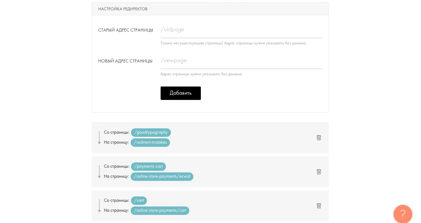 Редирект помогает перенаправлять пользователей и поисковики на актуальные страницы. В панели Tilda есть раздел для настройки редиректа 301, который указывает, что страница навсегда переехала на новый адрес.