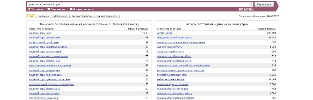 В первой колонке мы видим возможные вариации нашей ключевой фразы, а во второй — какие еще запросы задавали пользователи, искавшие корм. Цифры — частотность, т. е. сколько раз за последний месяц запрос фиксировался поисковиком.