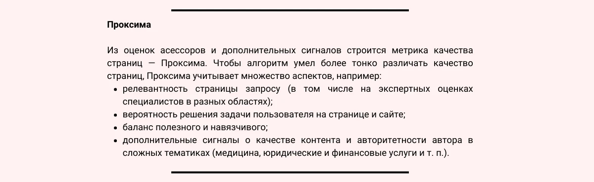 Поэтому с самого начала оптимизаторы больше полагались на собственные исследования, чем на подсказки поисковиков. Например, когда была анонсирована “Проксима” — метрика качества страниц в Яндексе, был озвучен общий принцип ее работы.