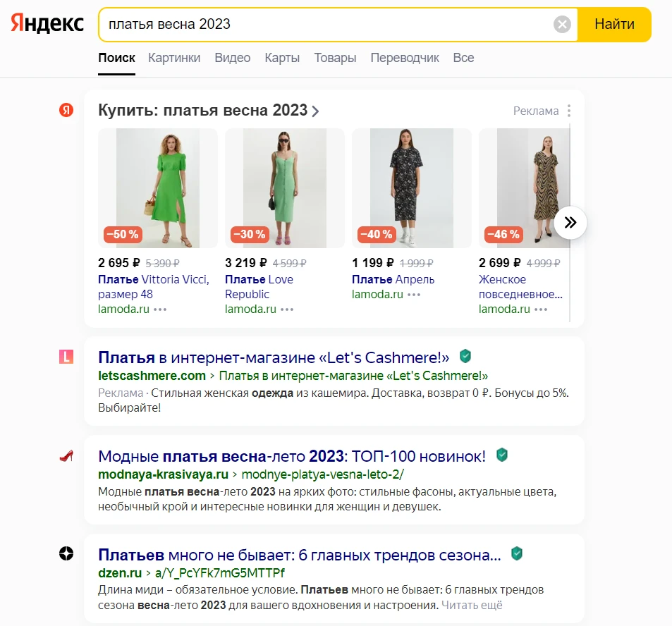 Вот как выглядит топ-10 по запросу «платья весна 2023». Взято из ПС Яндекс.