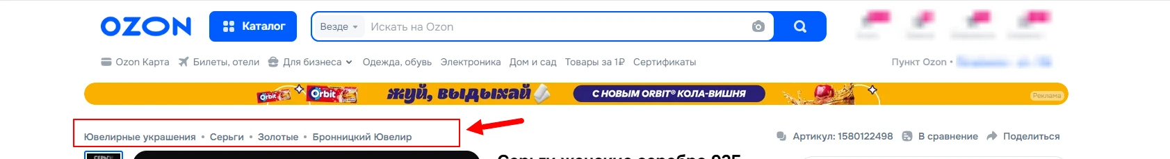 Например, как это сделано на «Озон»: Ювелирные украшения — Серьги — Золотые — Бронницкий Ювелир