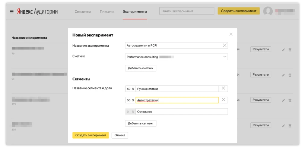 Чтобы равномерно распределить аудиторию, проводите А/B-тестирование с помощью функции «Эксперименты» в «Яндекс Директе». Она делит пользователей на случайные непересекающиеся сегменты: один человек не попадет одновременно и в тестовую, и в контрольную группу. А сравнить результаты тестов и выявить наиболее эффективные рекламные инструменты можно с помощью A/B-калькулятора.
