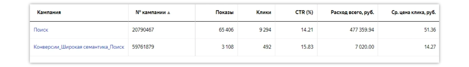 У первой кампании в таблице цена за клик выше, поэтому мы продвигаем ее с оплатой за конверсию. У второй этот показатель меньше — используем модель с оплатой за клик