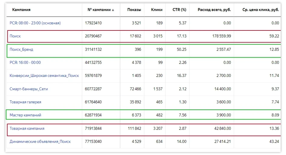 При анализе прошлых РК можно скачать отчет в виде таблицы и отмечать цветами хорошие и плохие результаты, чтобы искать закономерности. Например, какие объявления получили наибольший CTR