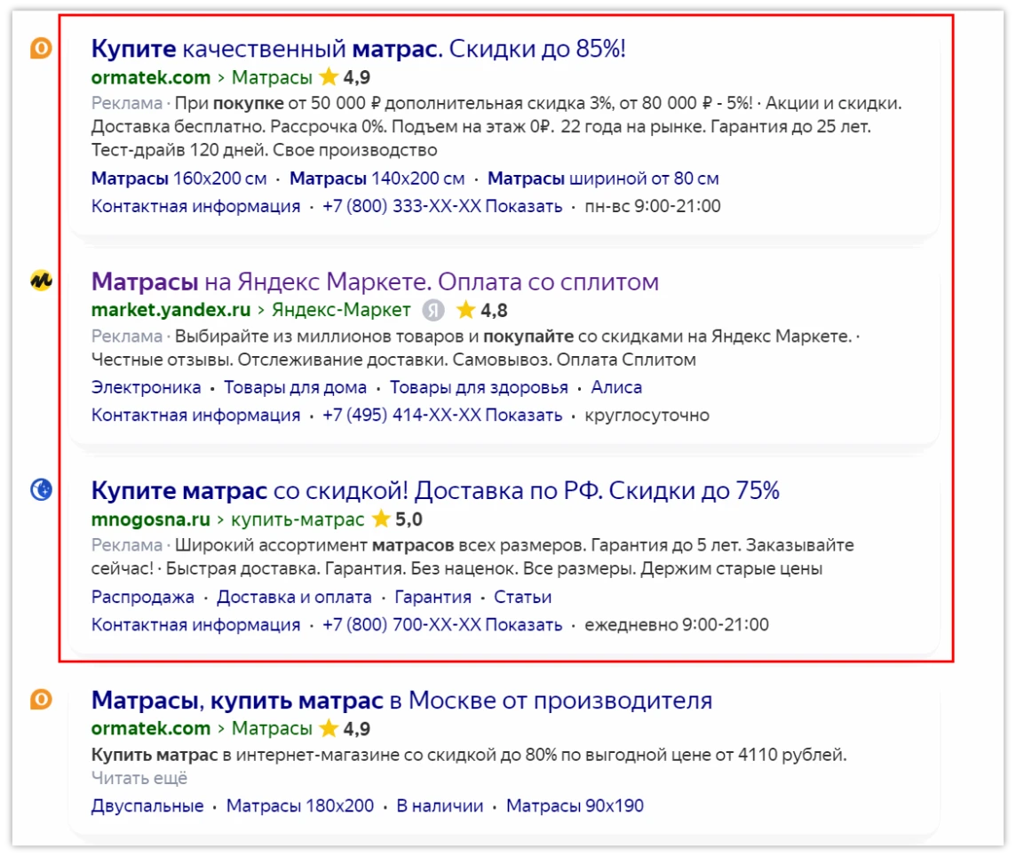 Скорее всего, клиент выберет компанию с самым сильным преимуществом. Поэтому, если у вас есть яркое УТП, лучше показываться ниже конкурентов. Так вы сделаете продажу и при этом сэкономите на стоимости клика. Главное — попасть в блок спецразмещения, то есть находиться в топе не ниже третьего-четвертого места.