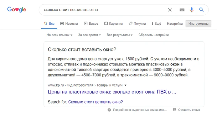 Например, можно попробовать попасть в блок быстрых ответов Гугл, который выводится в самом верху над выдачей. Согласно нашему опыту, попасть в него не просто, но попытаться однозначно стоит: оптимизируйте один из верхних текстовых блоков на странице с учетом запроса, по которому выводится быстрый ответ в выдаче. Как правило, эти запросы начинаются с фраз «как», «сколько», «когда». Емко и кратко дайте ответ на этот запрос в выделенном абзаце, впишите ключевую фразу.
