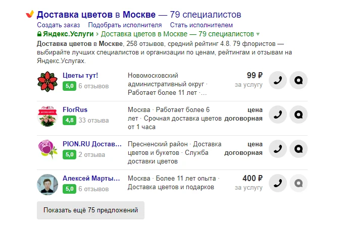 В Яндексе подобный блок встречается реже. Зато здесь больше поисковых колдунщиков, в которые также можно попасть – от Яндекс.Маркета до Яндекс.Кью. Например, регистрация в Яндекс. Услугах, подробно заполненный без ошибок профиль и высокий рейтинг организации в Я. Справочнике дает возможность компании находиться одновременно и в ТОП-10, и в колдунщике: