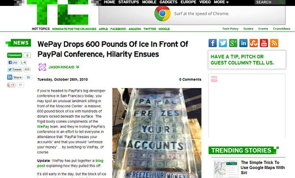 Ярким примером вирусного маркетинга можно назвать акцию платежной системы WePay, направленную против своего главного конкурента, компании PayPal. Перед входом на конференцию PayPal они выставили огромную глыбу льда в 600 фунтов. Посыл сработал блестяще, так как клиенты PayPal постоянно жаловались на непредсказуемую «заморозку» их аккаунтов, что, соответственно, мешало им снимать свои собственные заработанные деньги.
