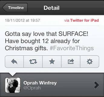 Маркетологи компании Microsoft решили прорекламировать свой продукт с помощью известной телеведущей Опры Уинфри. Но провалились. Давайте внимательно посмотрим на пост звезды в «Твиттере». Опра пишет восторженный отзыв о планшете Surface. И мало того, что само сообщение выглядит как неприкрытая реклама, так еще и отправлено оно с планшета компании Apple – конкурента Microsoft.