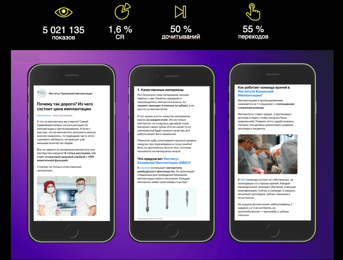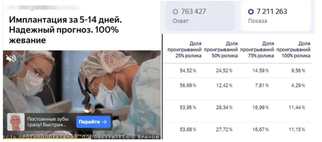 Изначально были запущены текстовые и графические рекламные кампании (РК) в «Поиске» и рекламной сети. Это позволило протестировать различные креативы, аудитории и получить первые лиды. Однако столкнулись с ограничениями: высокая конкуренция, геотаргетинг (Москва) и недостаточная осведомленность аудитории о базальном методе имплантации.