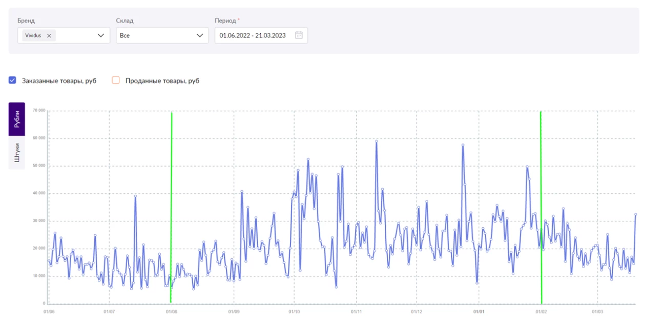 Если обратиться к внутреннему графику WB, то мы увидим повышение суммы заказов товаров за период с августа 2022 г. по январь 2023 г.
