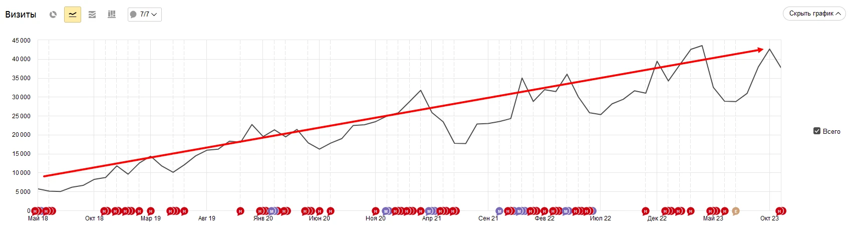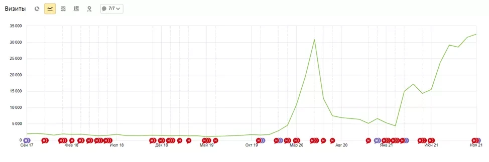 Ниже отражена динамика роста посещаемости проекта с момента старта работ с мая 2018 по ноябрь 2023.