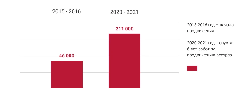 В начале продвижения (2015-2016) органический трафик из поисковых систем составлял 46 000 визитов в год, в 2020-2021 году количество визитов увеличилось, и составило 211000 визит в год. Через шесть лет сотрудничества трафик ресурса из поиска увеличился в 4,5 раза.