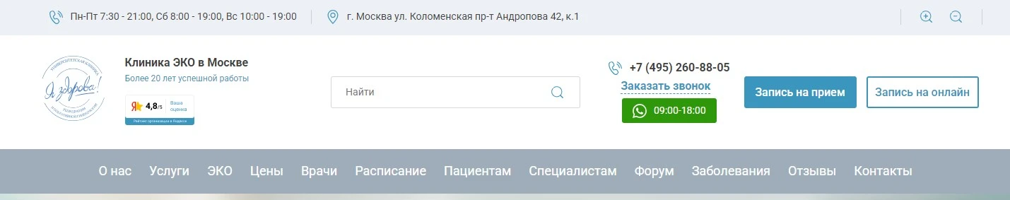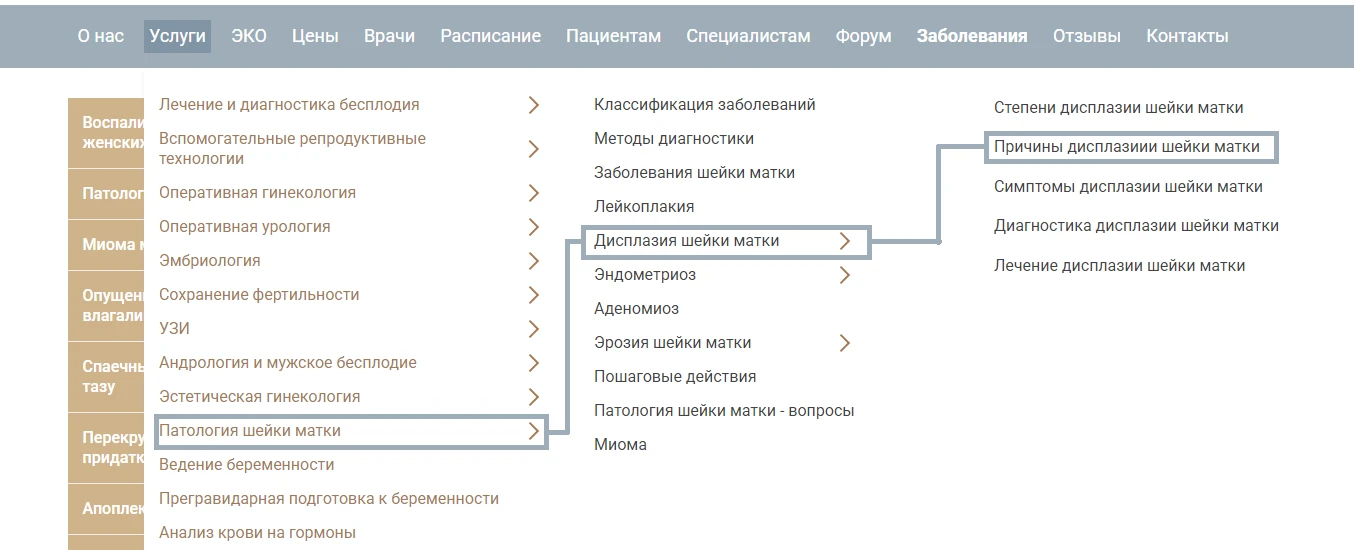 На некоторых страницах прайс-листы получились довольно объёмными, так как пришлось учесть множество возможных вариантов лечения. Например, на странице «Лечение и диагностика бесплодия» блок с ценами стал ключевым элементом. Анализ поведения пользователей показал, что они активно взаимодействуют с этим разделом, что не только повысило удобство навигации, но и положительно сказалось на трафике.