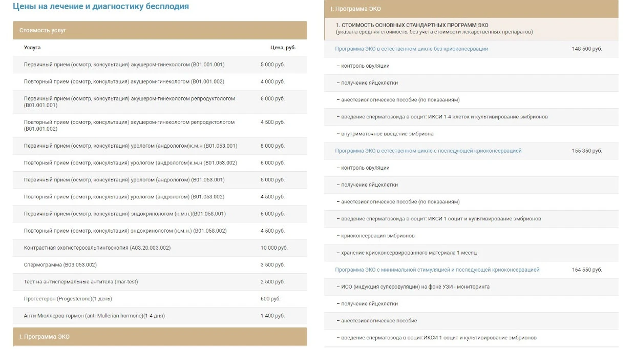 Чтобы учесть эти нюансы, мы разделили страницы на две группы. Там, где услуги имеют фиксированную стоимость (например, анализы), цены были указаны напрямую. А для сложных услуг, таких как лечение бесплодия, мы отказались от шаблонного варианта «от *** рублей». Вместо этого совместно с клиентом проработали все возможные сценарии лечения и представили информацию в понятном и структурированном виде.