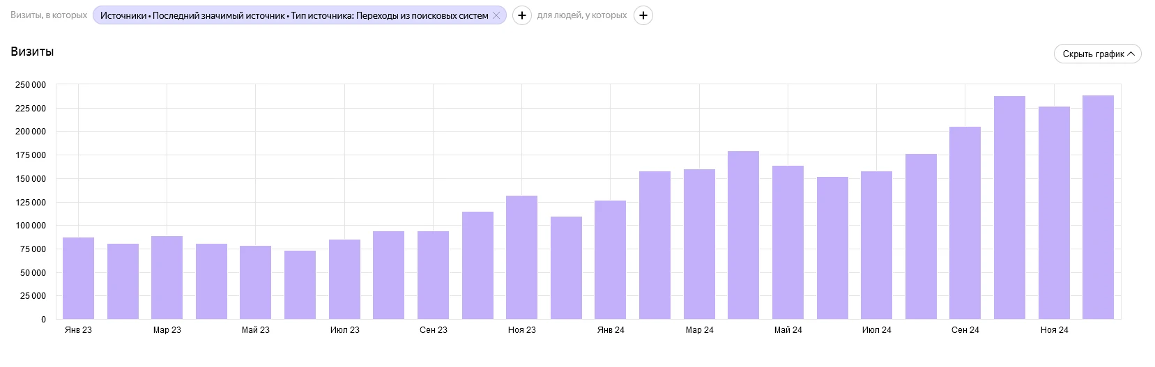 Мы заметили аномальный рост трафика, не соответствующий поведению реальных пользователей. Провели анализ и выявили источники роботного трафика — ботов, которые искажали статистику и могли негативно влиять на позиции сайта. Определили их по IP-адресам и заблокировали доступ.