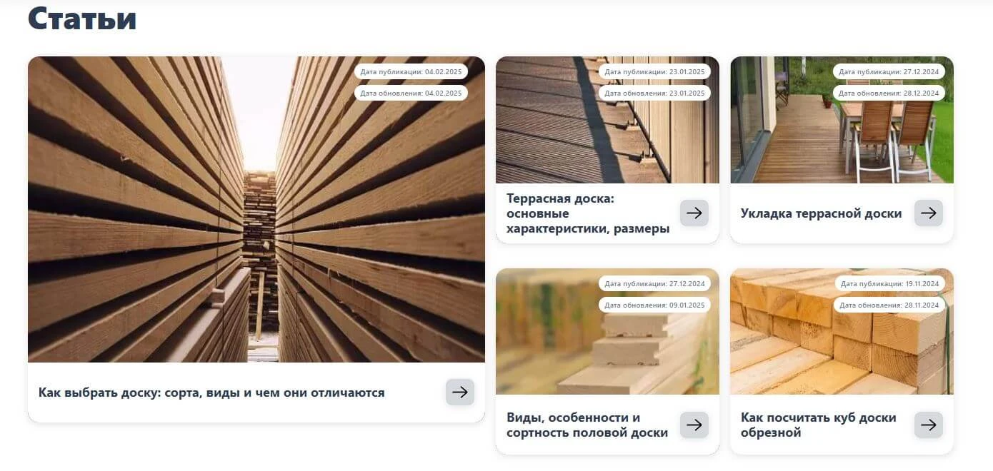 Оптимизировали ключевые страницы и сосредоточились на обновлении раздела со статьями. Написали несколько десятков материалов, подобрав для них тематические запросы, охватывающие широкий спектр потребностей аудитории (от «купить пиломатериалы» до «обшивка вагонкой»). Это усилило общую релевантность сайта.