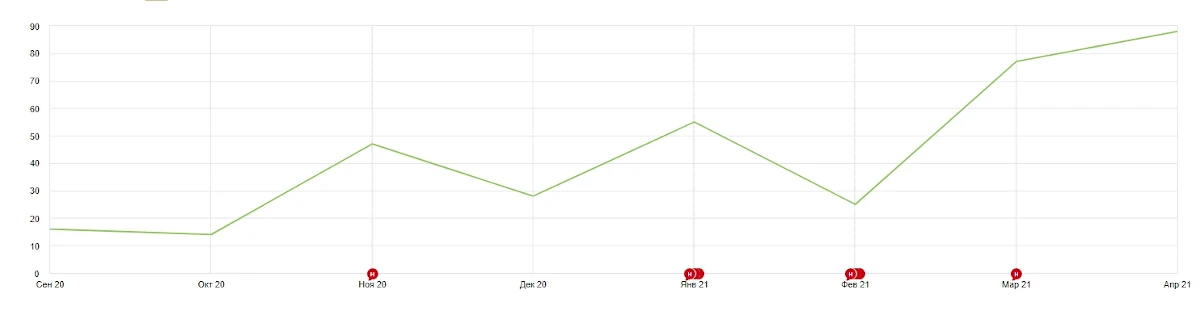 В декабре 2020 г. поисковый трафик сайта составлял 1740 визитов. В апреле 2021 г. достигнуто пиковое значение в 4522 визита за все время продвижения проекта.