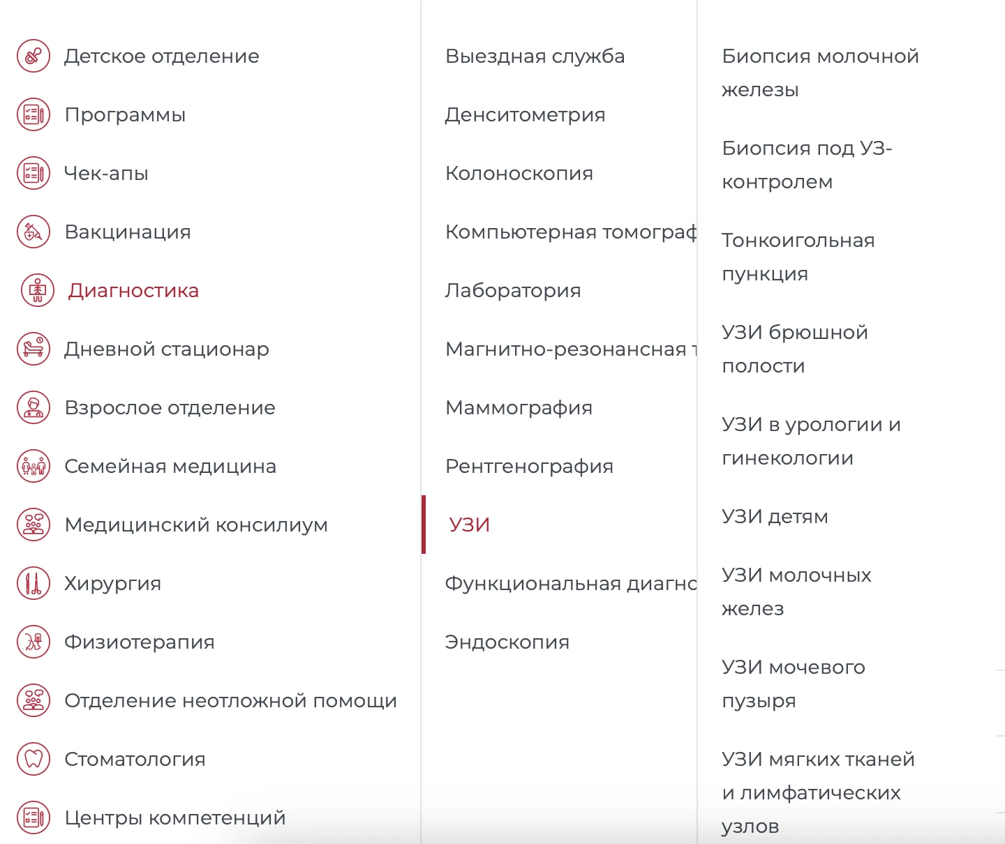 Мы разместили актуальные прайс-листы на всех страницах услуг и вынесли их в главное меню. Это решение оказалось важным, так как информация о стоимости часто влияет на выбор клиники. Это повысило прозрачность для пользователей и улучшило результаты по ключевым запросам.