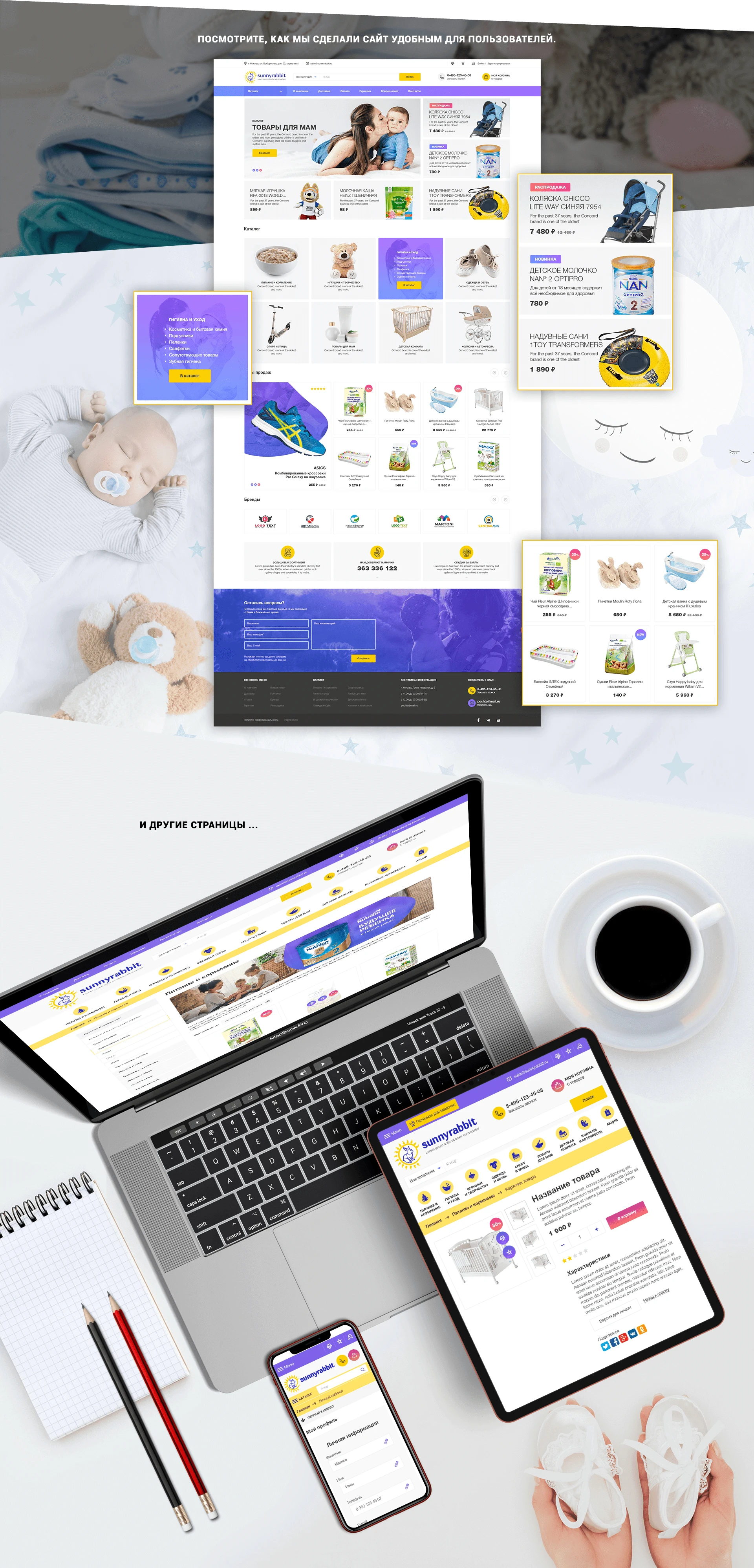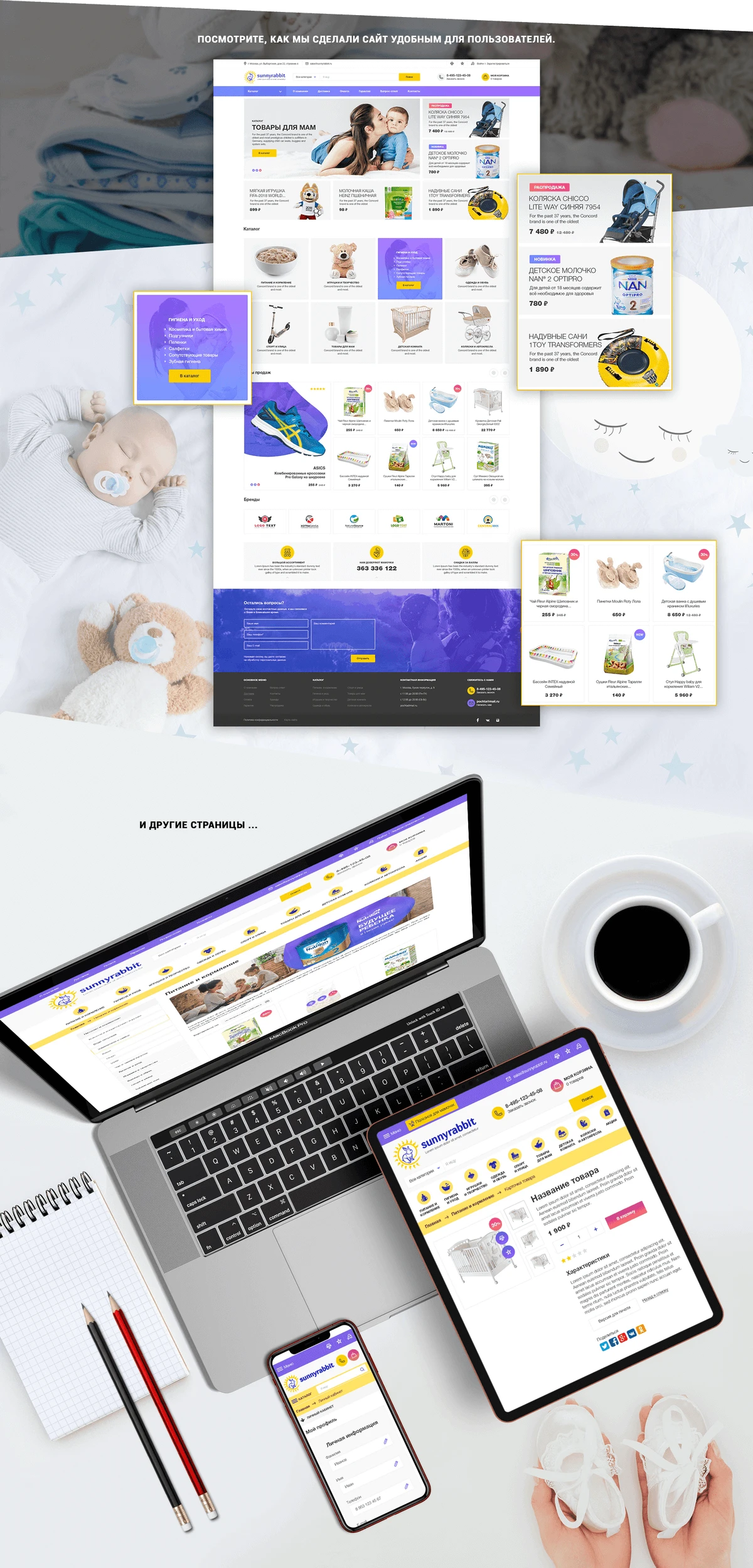 Компания «Солнечный кролик» предлагает широкий ассортимент детских товаров (одежду, коляски и автокресла, игрушки, товары для спорта и творчества, питание), а также продукцию для мам.Необходимо было создать дружелюбный, располагающий к себе и яркий интернет-магазин, в котором покупатели смогли бы совершать онлайн-заказы и следить за их статусом в личном кабинете. Главная цель — увеличить продажи компании.